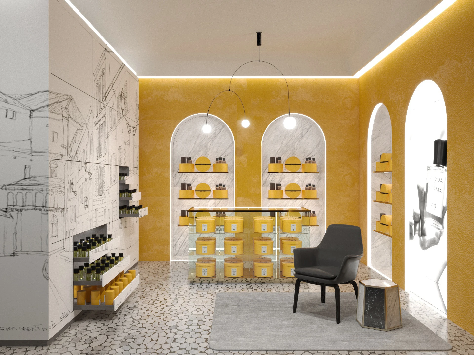 BBA is invited by the LVMH group to participate in the restricted competition for the design of the new concept for Acqua di Parma Brand. The idea was to convey the essence of the brand through the typical colors and italian character of the city of Parma. BBA proposed a reinterpretation of archetypes of the arch and the cloister, typical of the Renaissance buildings, using them to define space and the display of products.