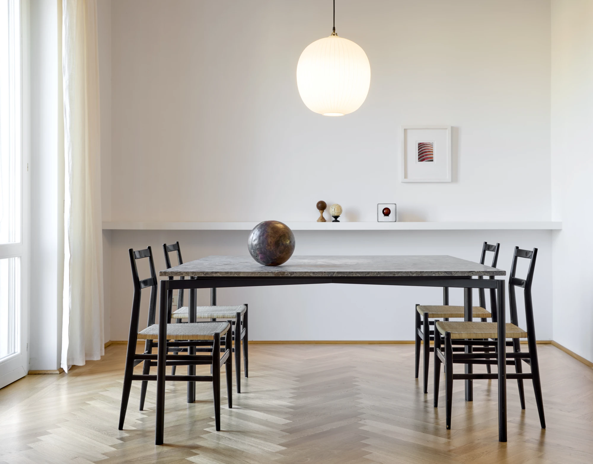 The apartment is located in a 1940s building that retains its architectural and historical dignity. The living room overlooks the garden of a convent, and the large window that connects it to the kitchen allows for continuous use of space and light, establishing a connection between the street-facing side of the house and the internal side. This conception of space benefits from natural light, and the carefully selected materials highlight the meticulous choice of furnishings, a combination of contemporary pieces and elements recovered from the same historical period as the building.