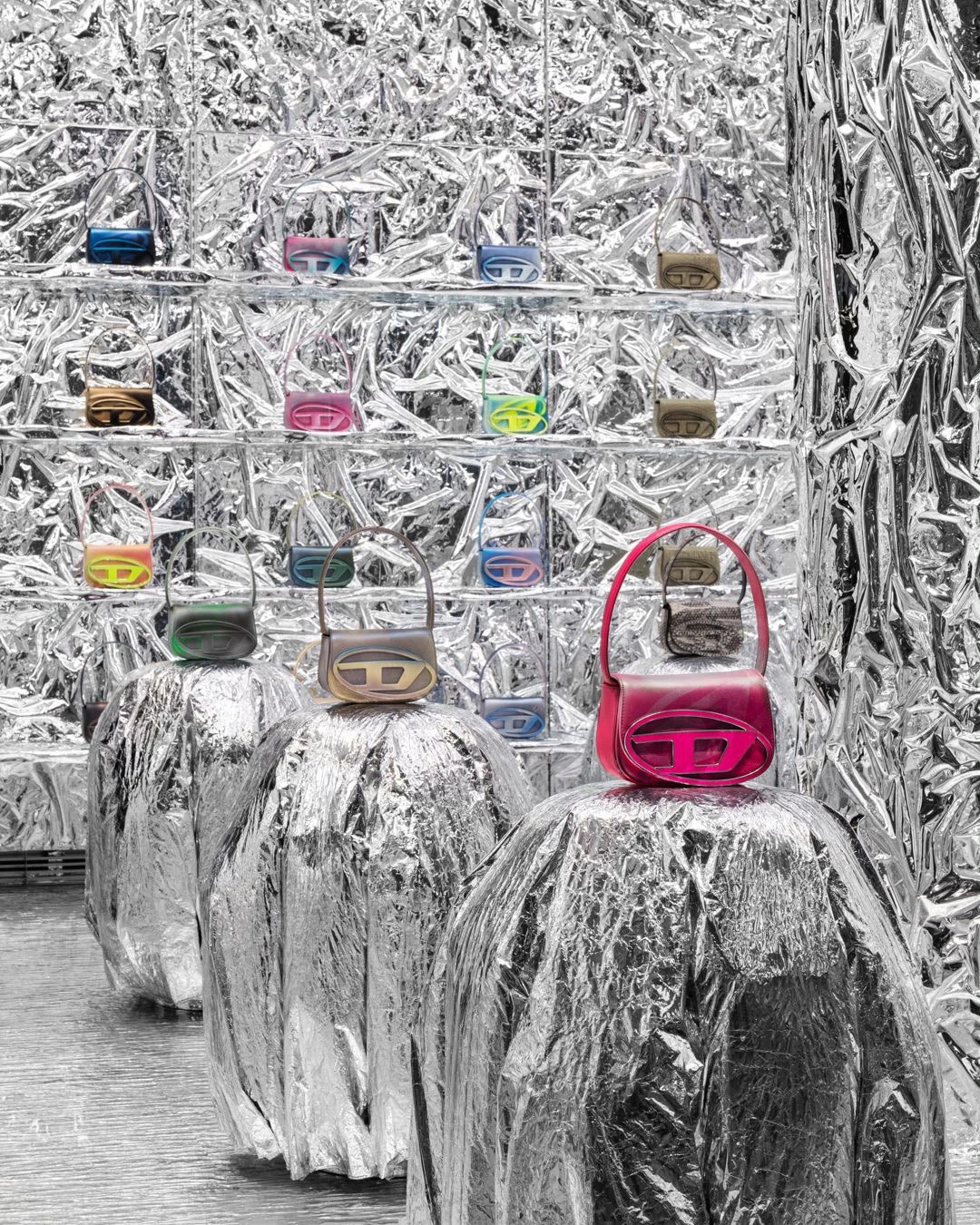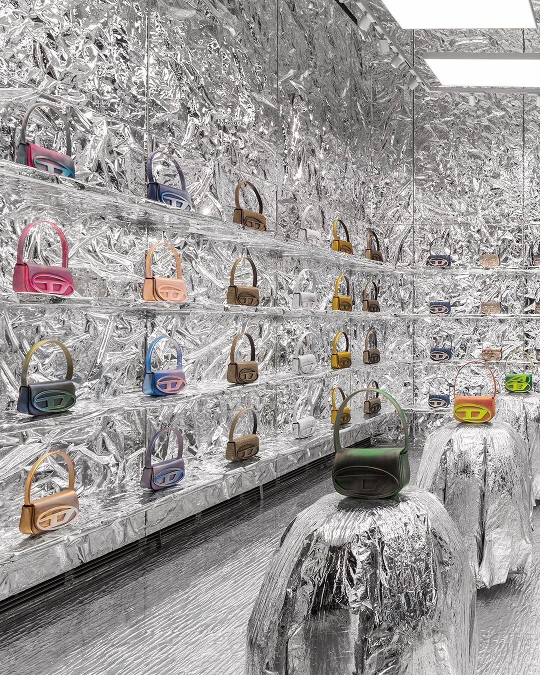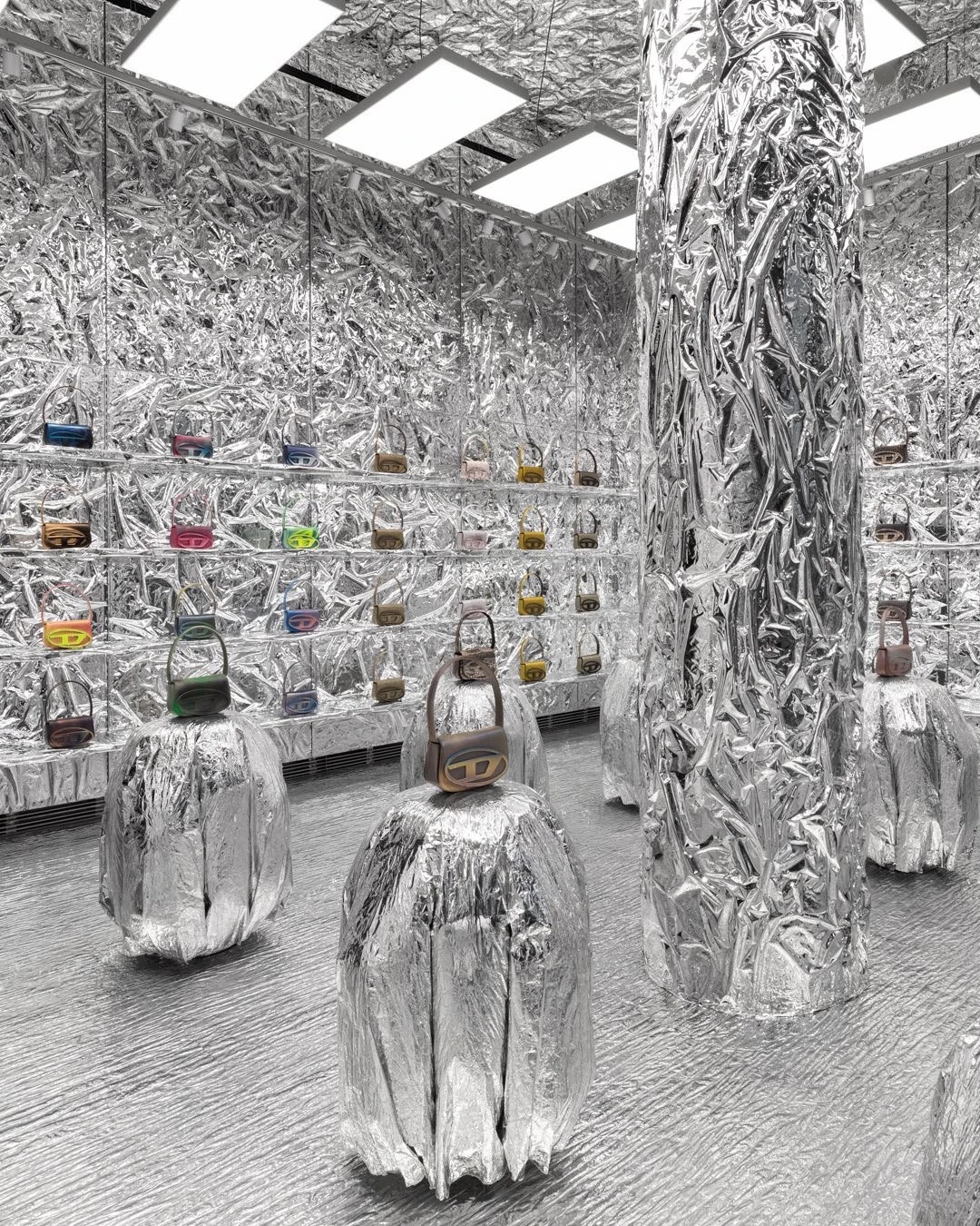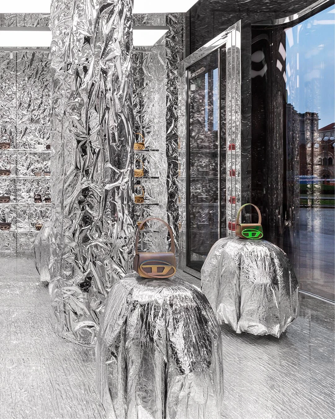 BBA STUDIO and the Diesel Store Planning & Interior Design Office have joined forces to create a new temporary store. The location is situated next to the Diesel Flagship store in San Babila, Milan and is scheduled to remain open for one year. Conceived as an engaging setting, it has been designed to offer an immersive experience as a multisensory artistic concept rather then a conventional retail establishment. The walls, floor, and ceiling are cladded with textured crushed silver fabric. The sensory experience is futher enriched by the presence of crystal resin accents, as well as suspended light boxes that intensify the reflective shine. Silver platforms, wraped in materials reminiscent of mylar balloons, showcase the 1DRbag collection.