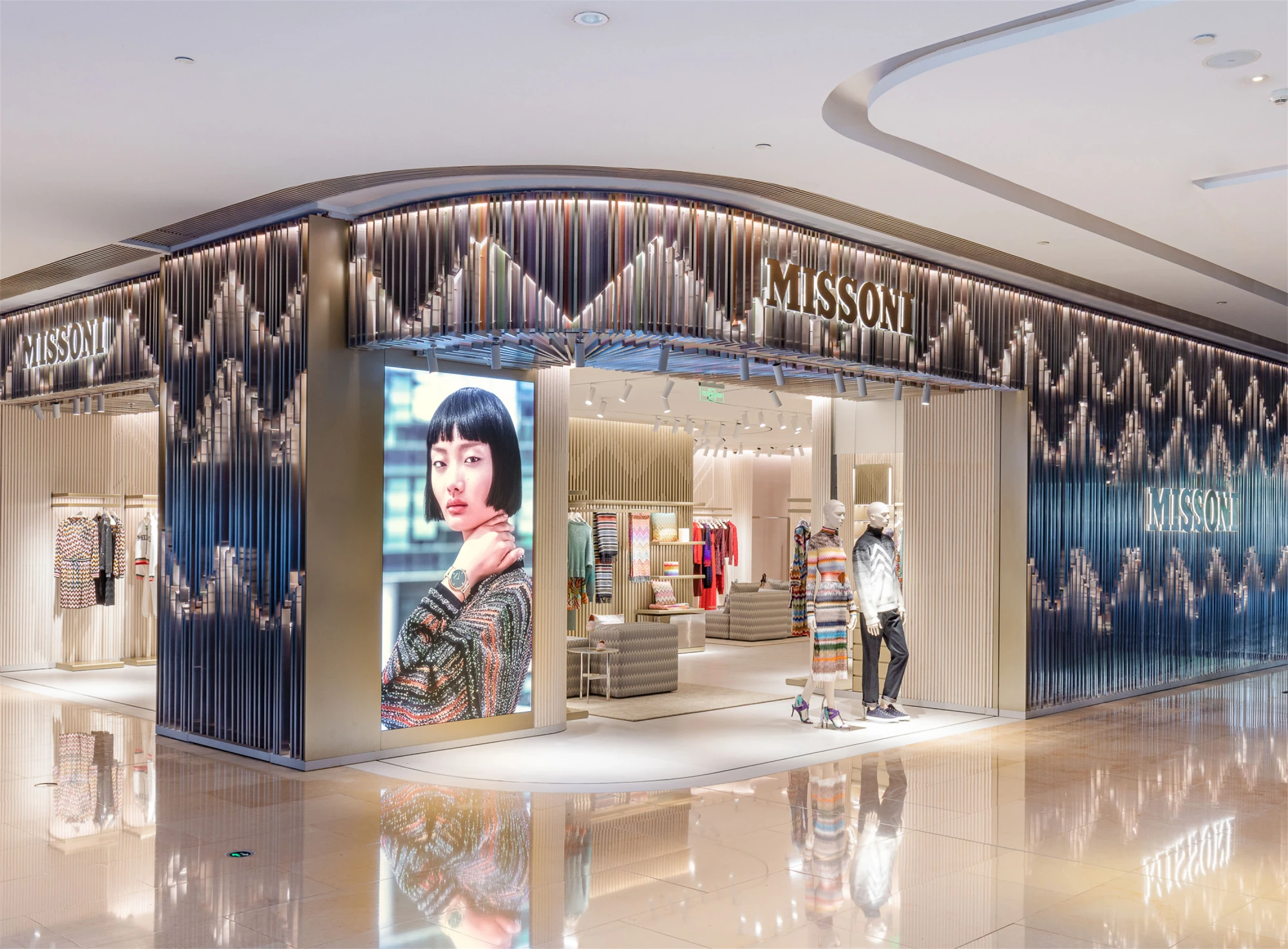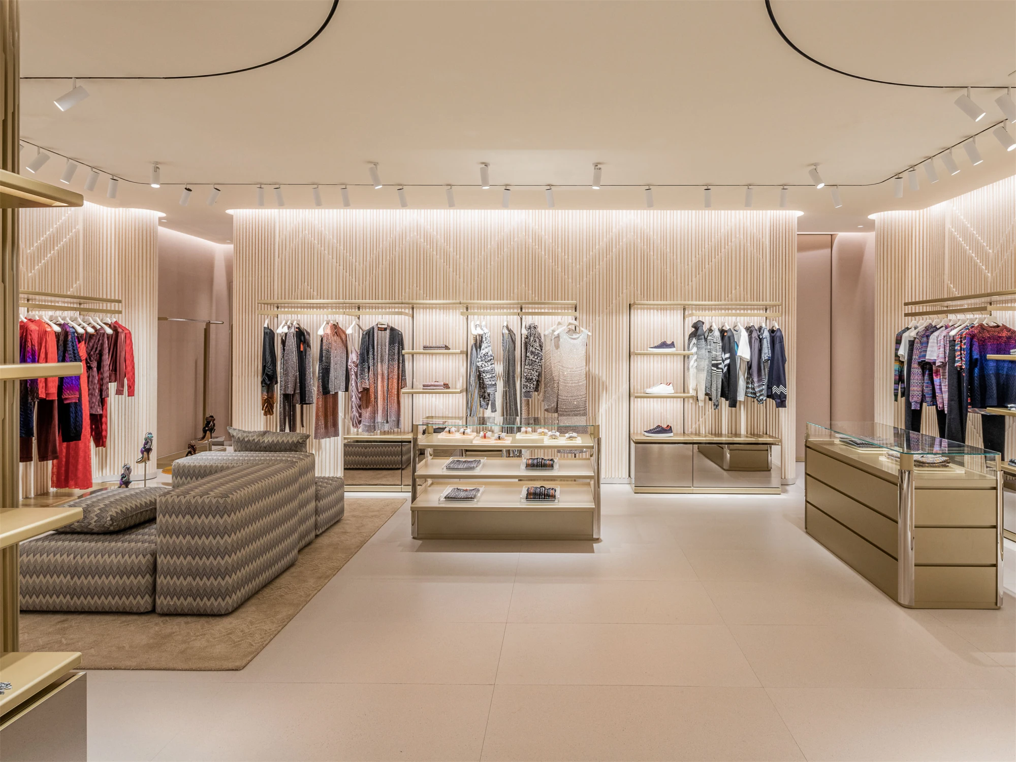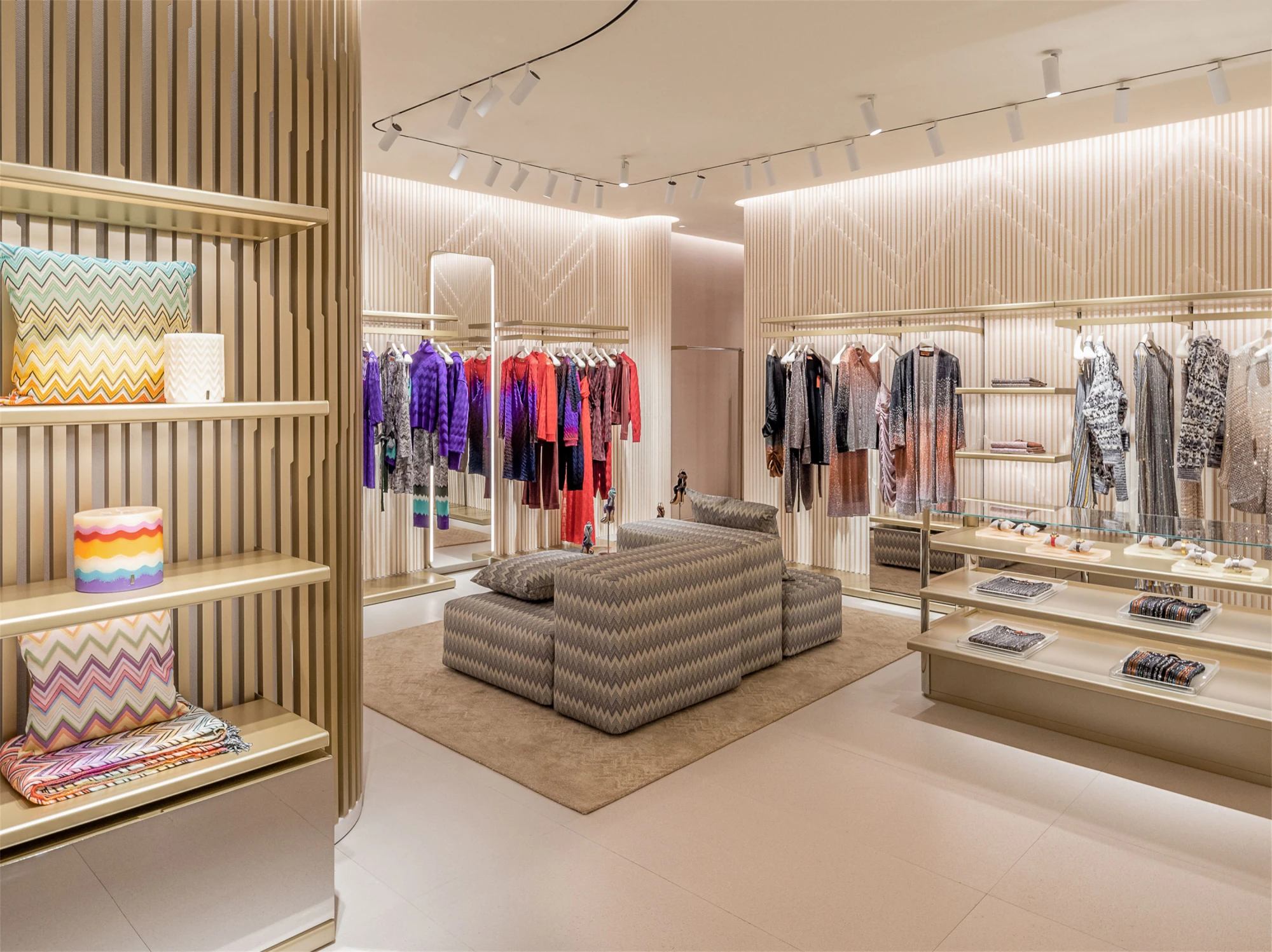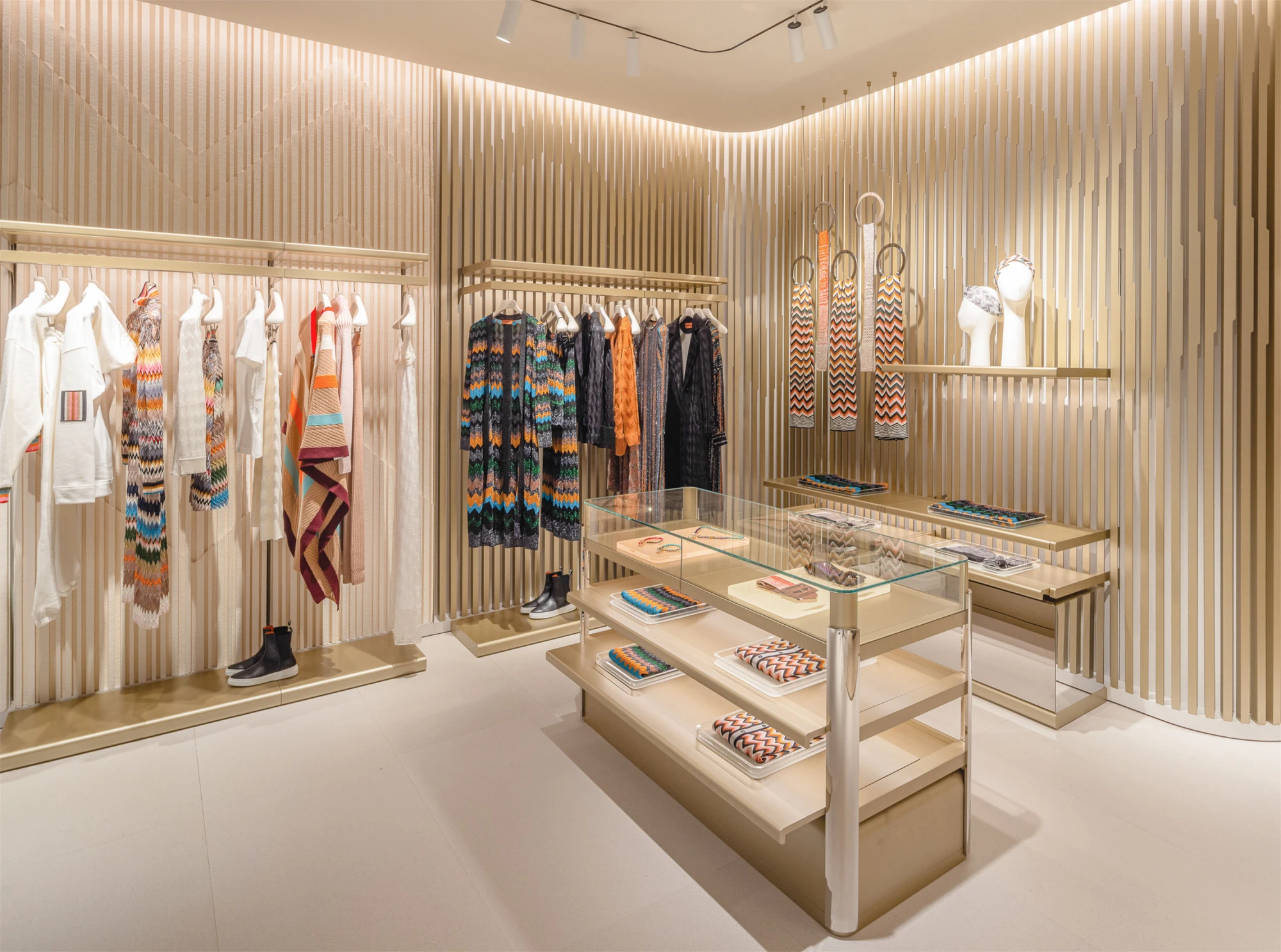 Missoni inaugurates its new flagship store in Shanghai. The project has been curated by BBA Studio. Missoni in Shanghai introduces a new store concept conceived by the Milan-based BBA design studio.The architectural concept creates a neutral environment wherein colours and fabrics of the clothing and accessories can stand out, without ever renouncing a certain level of characteristic style and refinement in the use and choice of materials and lighting.The new flagship store already reveals its identity to the public in the storefront design: the iconic zig-zag movement that characterises Missoni fabrics is here cleverly conjured up with colours, vertical metal elements and slashes of light that create dynamic energy, like a surface in movement. Inside the store lies a succession of walls that gently connect to each other, created partly in metal slats, partly with compressed cellulose, with the aim of creating a single continuous space across which the customer’s eye can slide without any obstacle. Around the entire perimeter, as a background detail, it is possible to identify the graphic texture of the internationally-famous knitwear which has become the key feature of Missoni style.