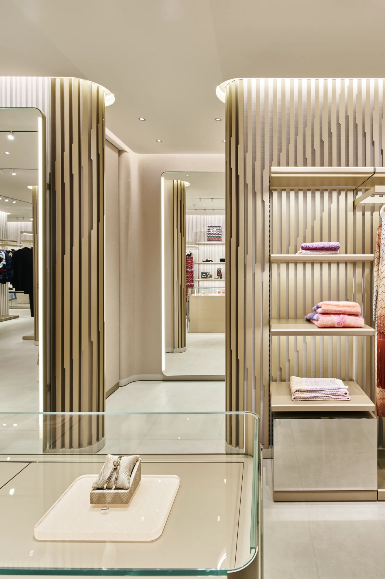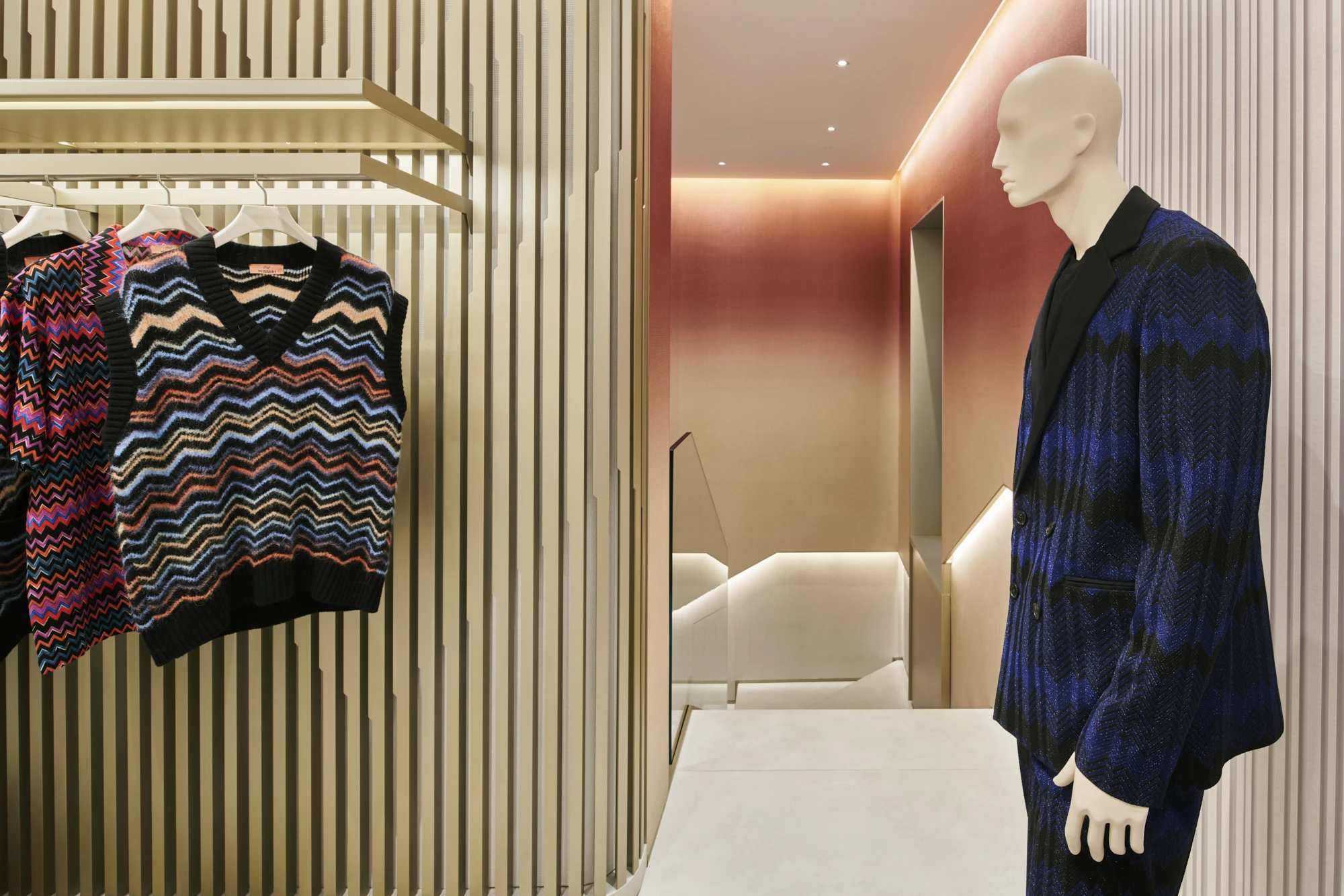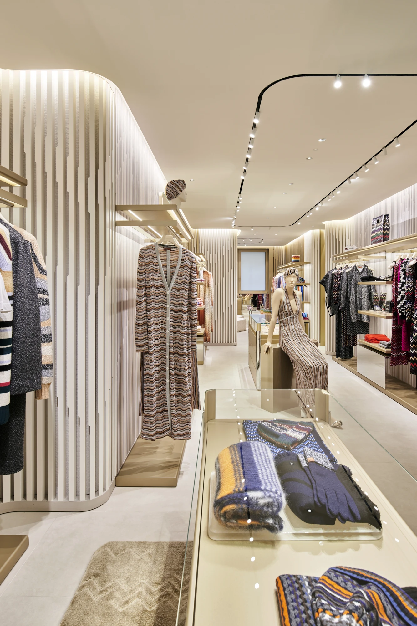 The idea is to create a neutral environment where the true protagonists are the colors and fabrics of the fashion house, while maintaining a degree of stylistic recognizability and a refined language in the choice of materials and lighting. Through a process of synthesis, the new architectural concept speaks of the Missoni world, highlighting the product without overshadowing it.