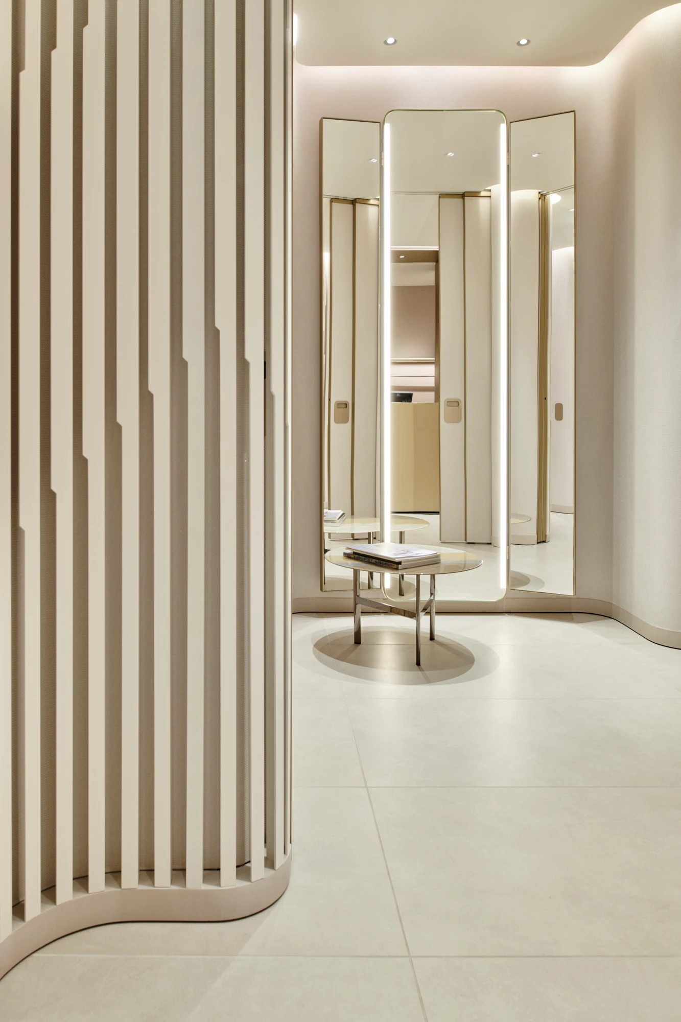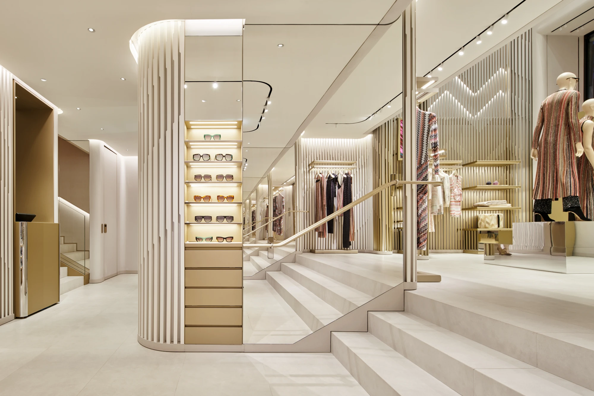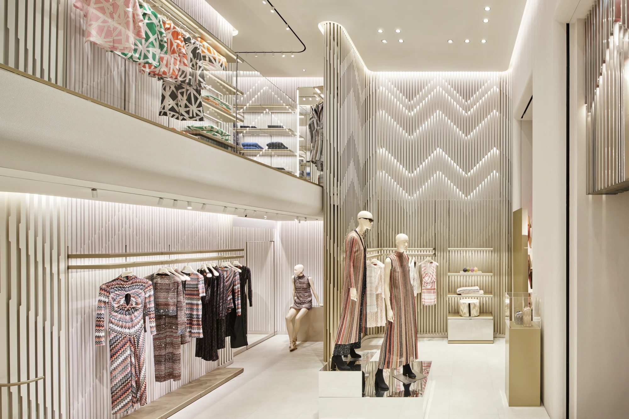 The idea is to create a neutral environment where the true protagonists are the colors and fabrics of the fashion house, while maintaining a degree of stylistic recognizability and a refined language in the choice of materials and lighting. Through a process of synthesis, the new architectural concept speaks of the Missoni world, highlighting the product without overshadowing it.